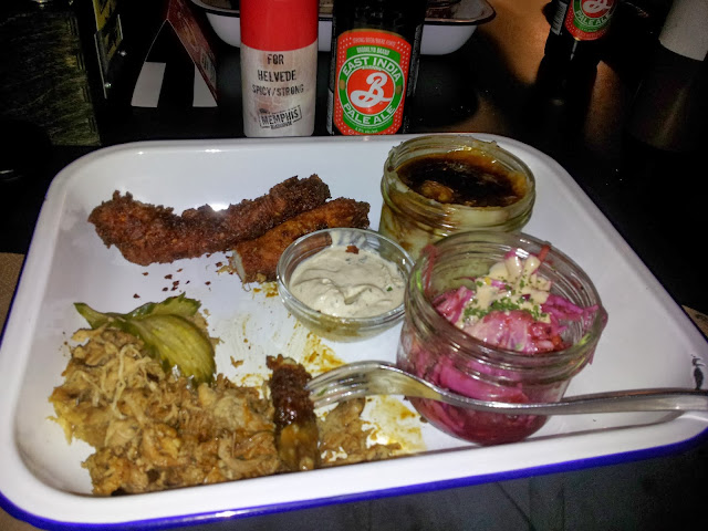 Ved siden av typisk sydstats BBQ-mat har de også et greit utvalg av øller, og en artig humor: sjekk flasken med BBQ-saus tv i bildet: "For helvede spicy/strong"